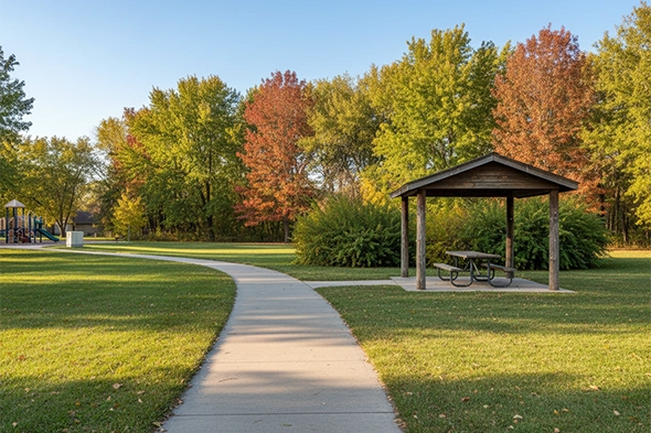 A quiet neighborhood park with shady trees, open lawns, and paved walkways perfect for daily dog walks. Papillion families appreciate the calm atmosphere, easy access, and comfortable spaces for casual outdoor time with their pets.